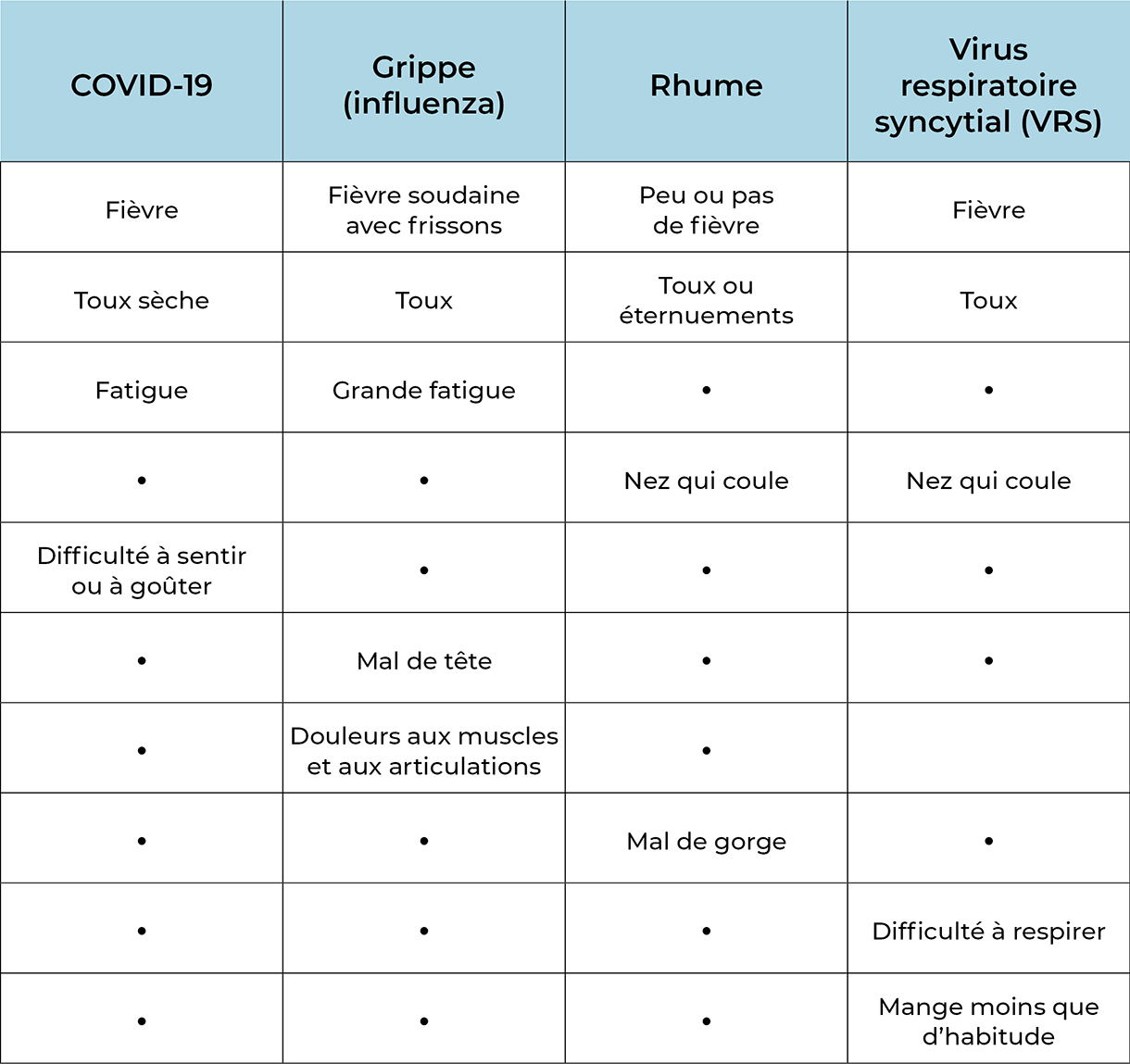 La COVID, c’est une maladie causée par un virus qui se transmet facilement d’une personne à l’autre. Elle peut donner de la fièvre, de la toux, de la fatigue, une perte du goût ou de l’odorat, des maux de tête et de la difficulté à respirer.